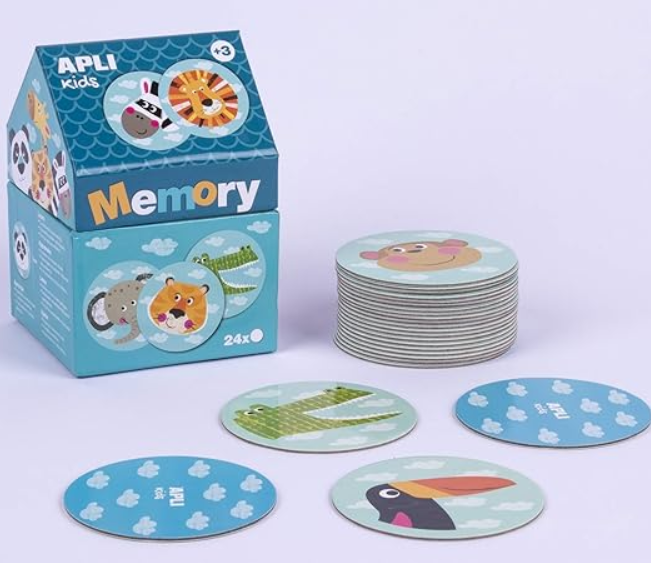 - Memory de 24 piezas tamaño diametro 8 cm con un total de 12 parejas de divertidos animales con dibujos infantiles de fácil reconocimeinto para los niños
