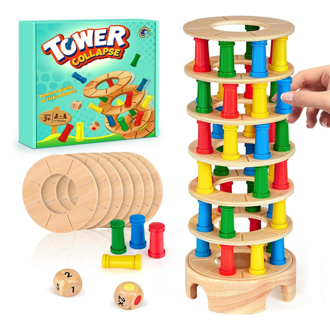 - Instrucciones de Juego: Se forma una torre apilada con la base, los pilares y los anillos. Se tiran los dados y se retiran columnas según las reglas. Quien derrumbe la torre, pierde.
